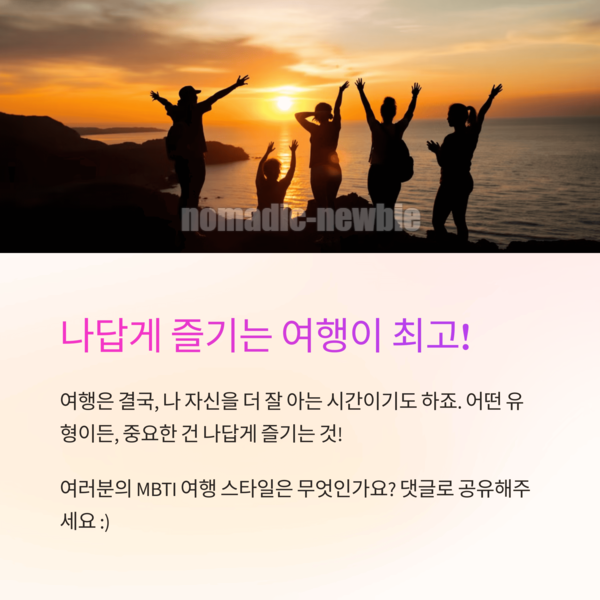 여행은 결국, 나 자신을 더 잘 아는 시간이기도 하잖아요. 오늘 소개한 MBTI 여행 유형이 여러분의 다음 여행을 더 즐겁고 의미 있게 만들어주는 힌트가 되었으면 해요. 어떤 유형이든, 어디로 가든, 중요한 건 나답게 즐기는 것! 혹시 공감되거나, 나랑 찰떡인 여행 스타일이 있었다면 댓글로 공유해 주세요. 여러분의 여행 이야기도 너무 궁금하니까요 :)