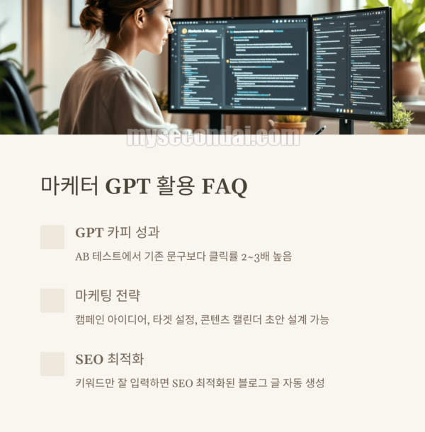 지금까지 마케터가 GPT 쓰면 벌어지는 일 5가지를 함께 살펴봤어요. 저도 처음엔 그저 “글 써주는 AI” 정도로만 생각했는데, 이젠 아이디어 회의, 문구 테스트, 콘텐츠 제작까지 하루 업무의 30%를 맡길 정도로 변했어요. GPT는 단순한 툴이 아니라, 마케터의 두 번째 두뇌가 되어줄 수 있어요. 오늘부터 여러분도, 그 강력한 변화를 직접 경험해보시길 바랍니다. 지금 바로 작은 프롬프트 하나부터, 실전 업무에 연결해보세요!