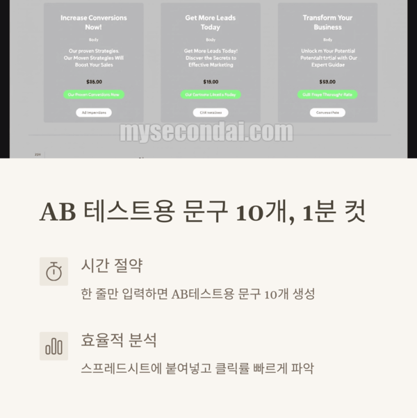 단순한 글 생성이 아니라, 성과 중심의 결과를 만드는 게 핵심이에요. 다양한 카피 테스트로 최적화하는 게 포인트!