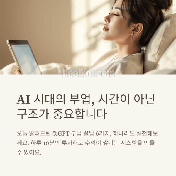 오늘 알려드린 챗GPT 부업 꿀팁 6가지, 하나라도 실천해보세요. 하루에 10분만 투자해도 수익이 쌓이는 시스템을 만들 수 있어요. 부업은 ‘능력’보다 ‘구조’가 더 중요하니까요.