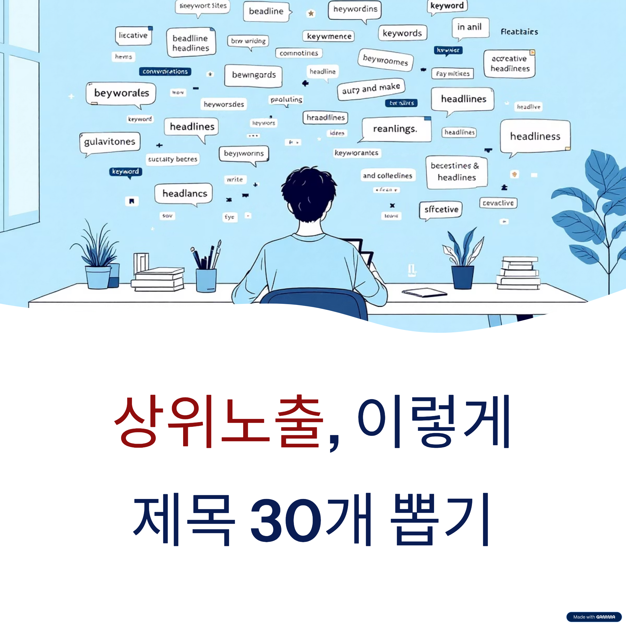 목표: [주제]로 상위노출 가능한 블로그 제목 30개 생성.
