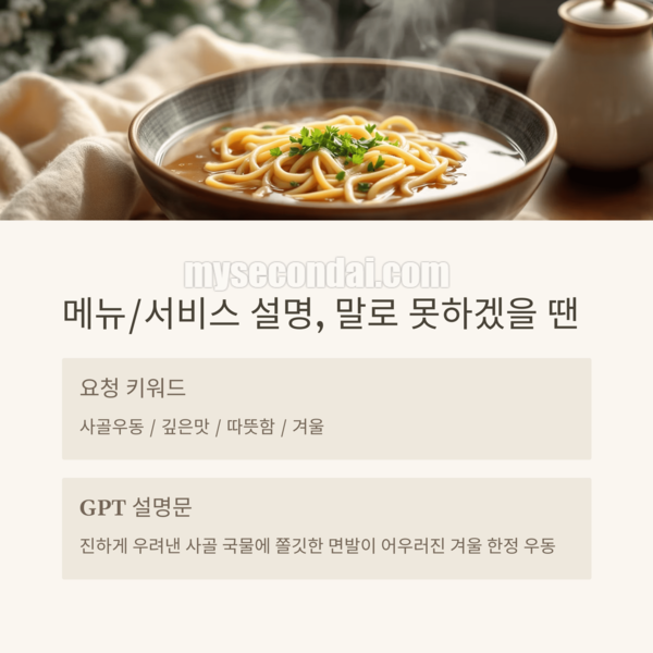 “국물이 깊고 진한 사골우동입니다” 그냥 이렇게 적자니 심심하고, 길게 쓰자니 말이 안 풀릴 때 있죠? GPT는 그런 걸 아주 잘 풀어줍니다.