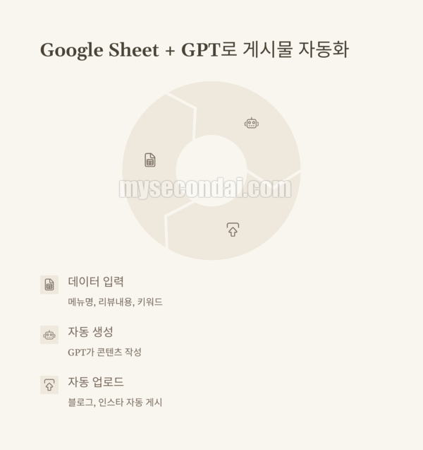AI를 정말 잘 쓰는 사장님들은 ‘시스템화’를 합니다. Google Sheet에 키워드를 입력하면, GPT가 블로그 글이나 후기 문장을 자동으로 만들어주는 구조예요.