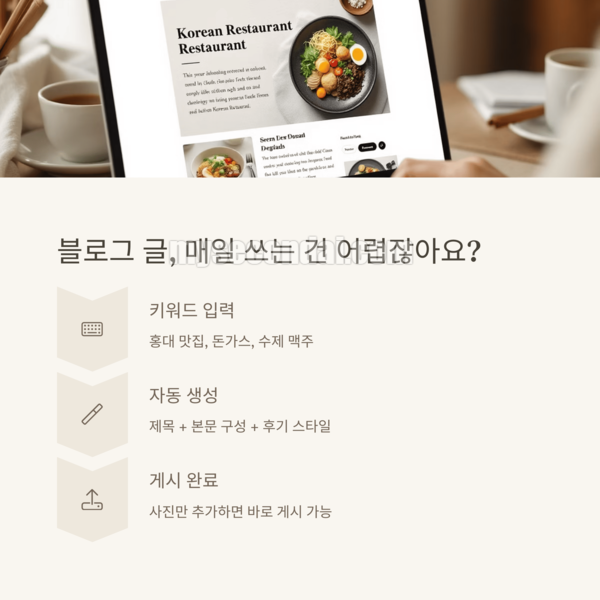 GPT는 키워드, 메뉴명, 가게 위치 등을 입력하면 블로그용 글을 자동으로 생성해줘요. 거기에 사진만 추가하면 바로 게시 가능한 수준이 됩니다.