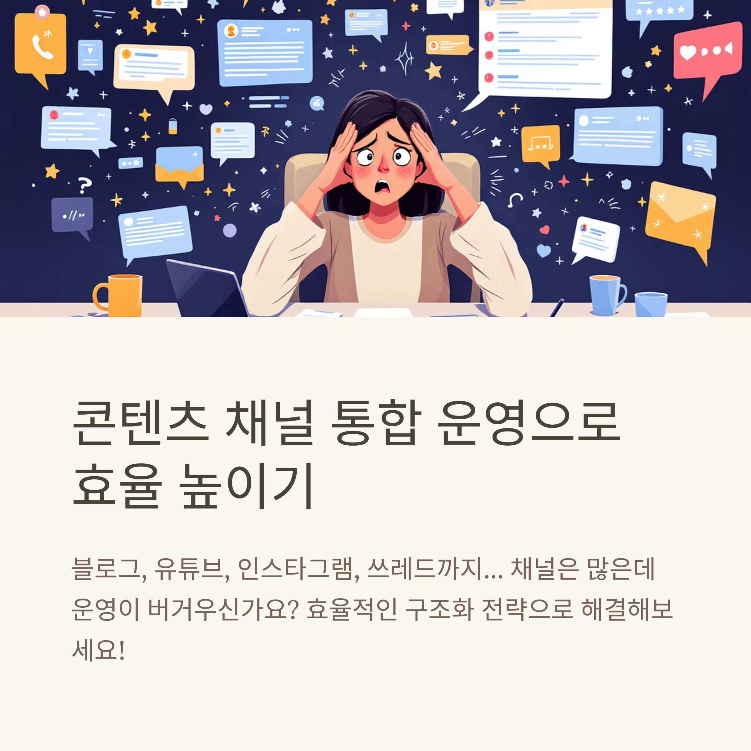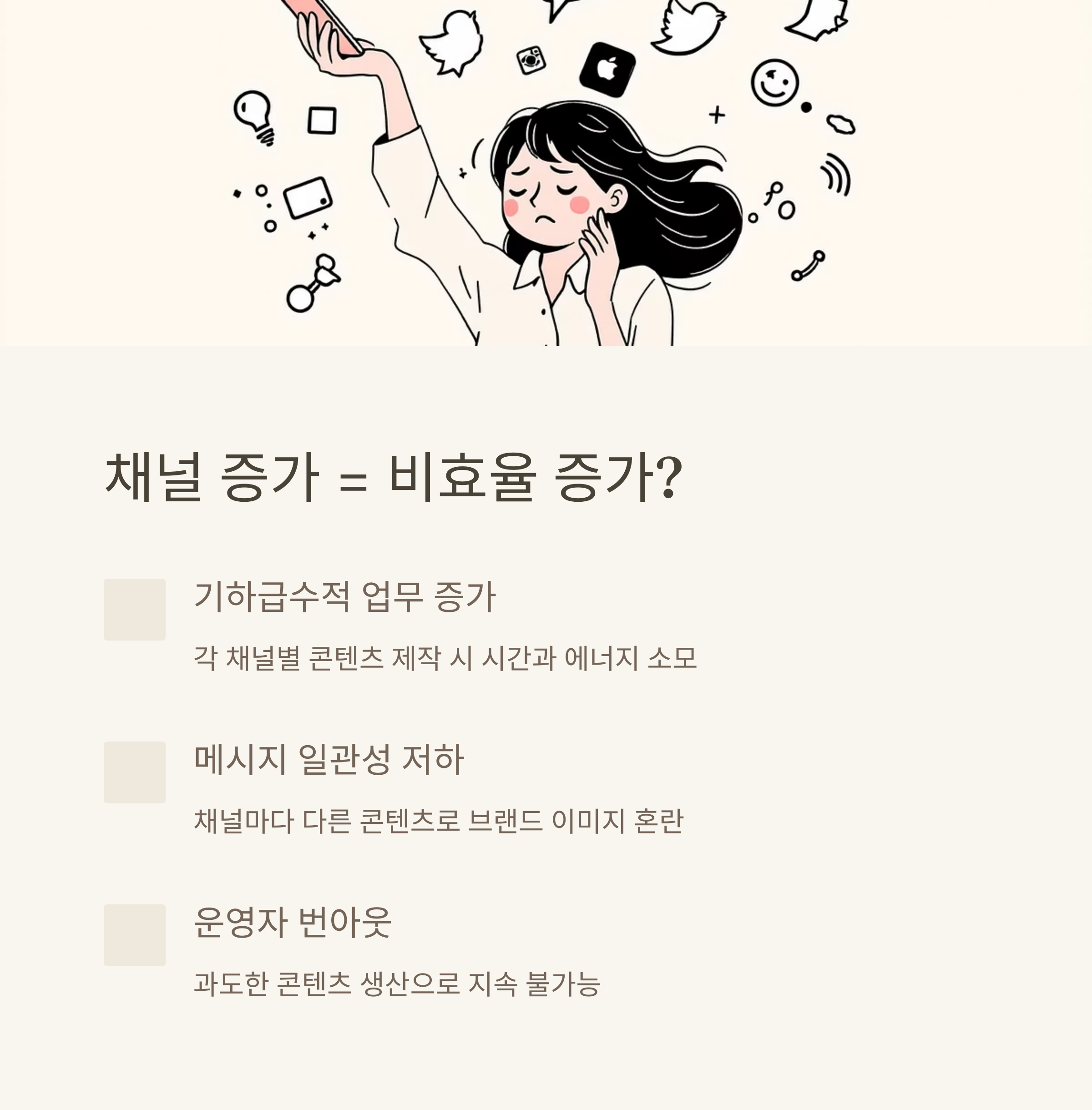콘텐츠 채널이 늘어나면 분명 노출 기회도 많아지죠. 하지만 운영 방식이 통합되어 있지 않으면 ‘채널이 늘수록 할 일도 기하급수적으로 많아지는’ 악순환에 빠지기 쉽습니다. 특히 각 채널에 맞춰 콘텐츠를 따로 제작하면, 시간과 에너지가 마구잡이로 소모돼요. 그뿐인가요? 메시지도 일관성이 없어지고, 운영자는 점점 번아웃에 가까워지죠.