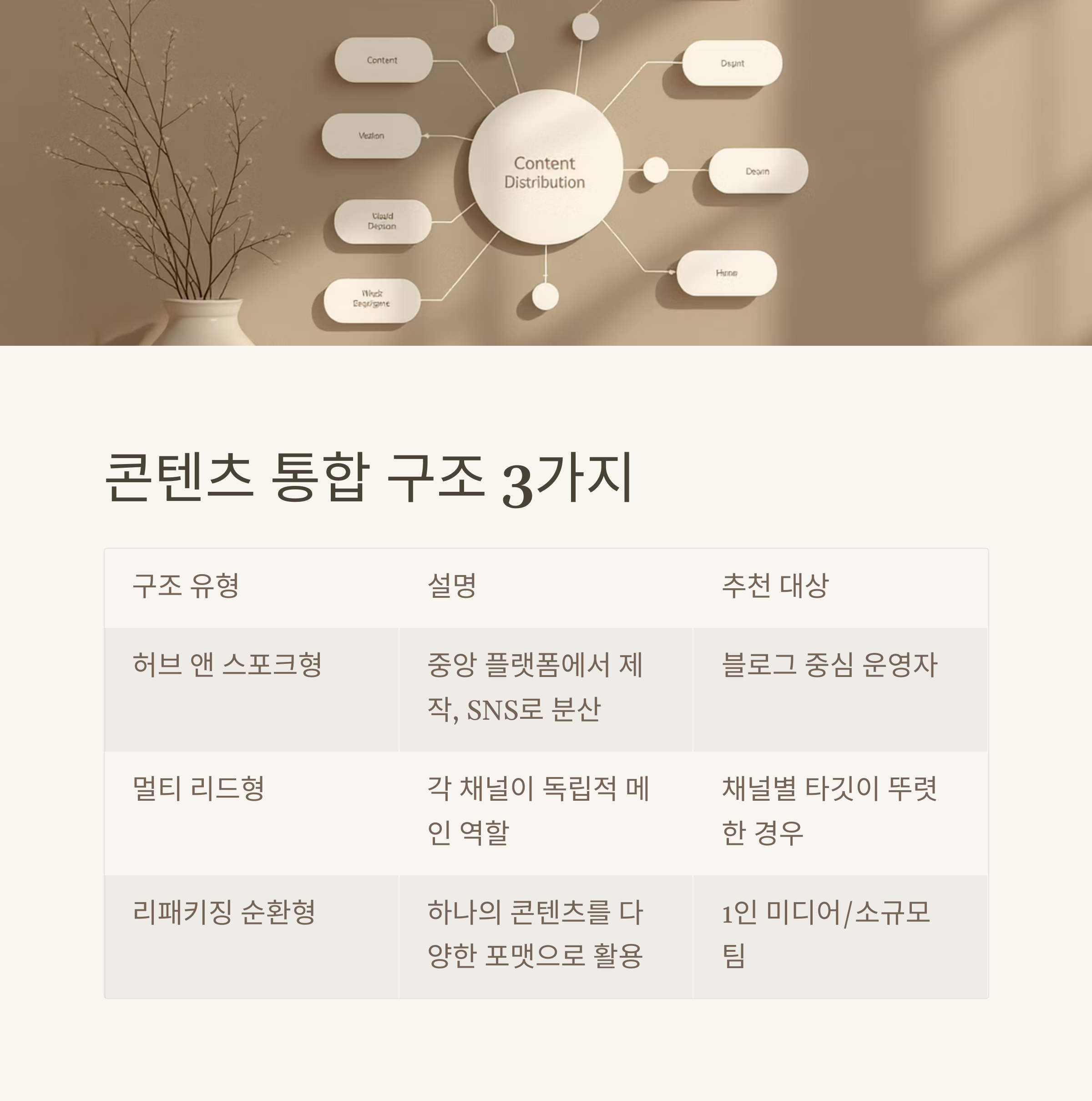 | 허브 앤 스포크형 | 중앙 플랫폼(블로그 등)에서 콘텐츠를 제작하고 SNS로 분산 배포 | 블로그 중심 운영자 |