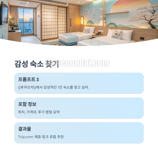 {{후쿠오카}}에서 감성적인 1인 숙소를 찾고 싶어. 위치, 가격대, 후기 평점 요약해서 추천해줘. Trip.com 제휴 링크 포함해줘.
