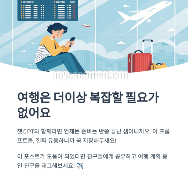 어떠셨나요? 여행은 더이상 복잡할 필요가 없어요. 챗GPT와 함께라면 언제든 준비는 반쯤 끝난 셈이니까요. 이 프롬프트들, 진짜 유용하니까 꼭 저장해두세요!