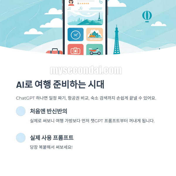 AI로 여행 준비하는 시대, 여러분은 얼마나 활용하고 계신가요? ChatGPT 하나면 일정 짜기, 항공권 비교, 숙소 검색까지 손쉽게 끝낼 수 있어요.