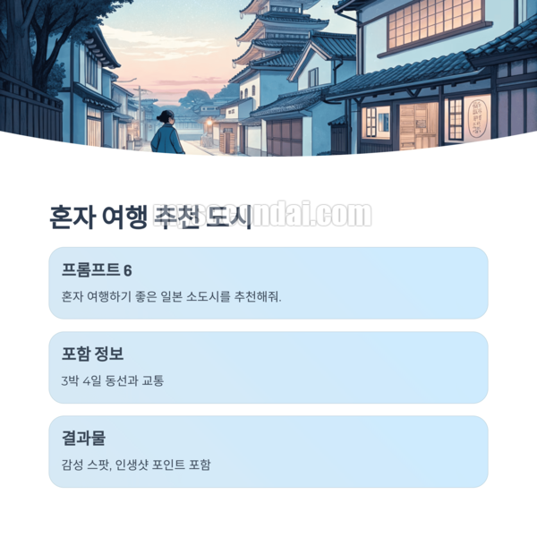 혼자 여행하기 좋은 일본 소도시를 추천해줘. 3박 4일 동선과 교통, 감성 스팟, 인생샷 포인트 포함해줘.