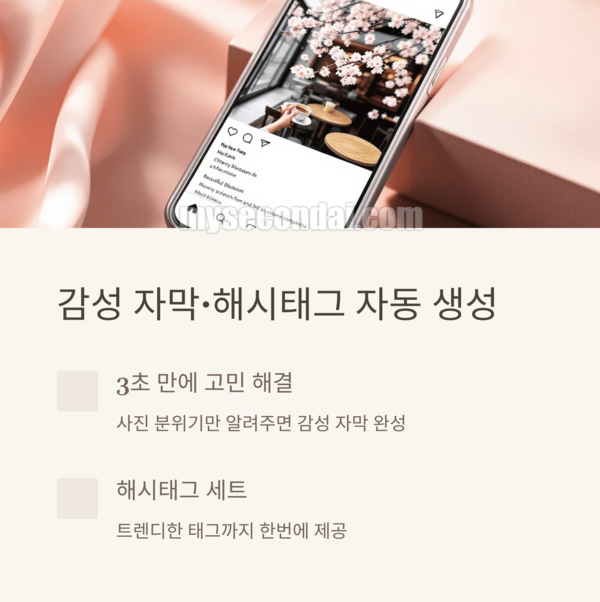 네, 상황이나 사진 분위기만 입력해도 감성 자막과 해시태그를 세트로 추천해줍니다. 계절별, 시간대별 감정까지 반영할 수 있어요.