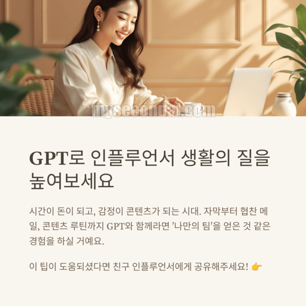 인플루언서가 GPT를 제대로 쓰면, 시간이 돈이 되고, 감정이 콘텐츠가 됩니다. 오늘 소개한 5가지 실전 예시처럼, 자막 하나도, 댓글 한 줄도 GPT가 함께 만들어주는 시대예요. 특히 협찬 메일, 릴스 대본, 콘텐츠 루틴 자동화까지 모두 직접 해보시면 진짜 ‘나만의 팀’을 얻은 것 같은 감각이 들 거예요. 바쁜 하루 속, 여러분의 감성과 브랜드를 더 멋지게 지켜줄 GPT 활용법. 지금 바로 한 줄부터 시작해보세요!