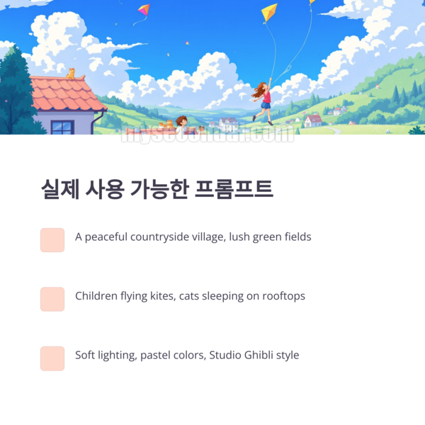 아래는 제가 DALL·E, Midjourney 모두에서 테스트해 본 프롬프트예요. 이 구성대로 조합하면 거의 실패 없는 ‘지브리스러운’ 결과물이 나옵니다.