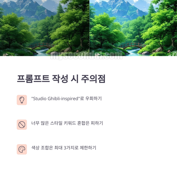 이미지 생성 AI는 생각보다 똑똑하지만, 뉘앙스에는 예민해요. 지브리 스타일도 똑같이 적용되지 않더라구요. 그래서 아래 커스터마이징 팁을 참고하면 훨씬 더 세련된 결과를 얻을 수 있어요.