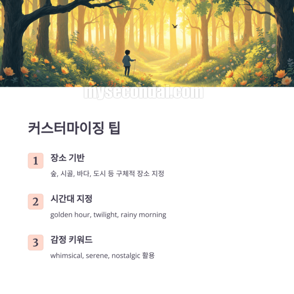 - 감정 키워드 활용: whimsical, serene, nostalgic 등