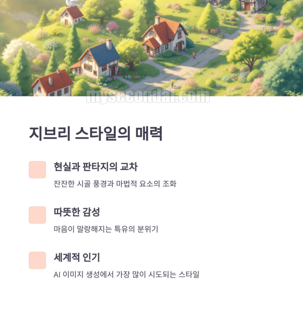 지브리 애니메이션의 세계는 현실과 판타지가 아름답게 교차하는 느낌이 있어요. 잔잔한 시골 풍경, 따뜻한 햇살, 그리고 마법 같은 요소까지. 이 감성은 전 세계적으로 사랑받고 있고, AI 이미지 생성 툴을 사용할 때 가장 많이 시도되는 스타일 중 하나예요. 저처럼 ‘마음이 말랑해지는 이미지’를 원한다면, 지브리 스타일만한 게 없더라고요.