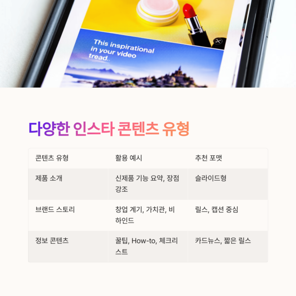 | 정보 콘텐츠 | 꿀팁, How-to, 체크리스트 | 카드뉴스, 짧은 릴스 |
