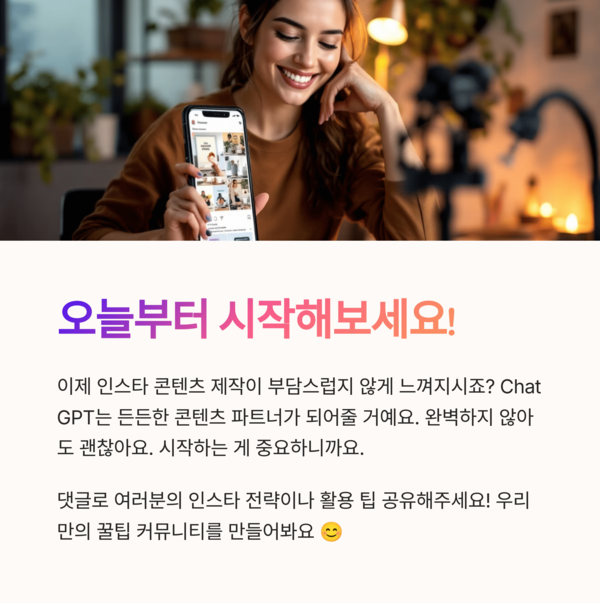 이제 인스타 콘텐츠 제작이 그렇게 부담스럽지 않게 느껴지시죠? 저도 처음엔 어렵고 귀찮기만 했는데, Chat GPT를 활용한 뒤로는 마치 든든한 콘텐츠 파트너가 생긴 느낌이에요. 여러분도 오늘부터 하나씩 시도해보세요! 완벽하지 않아도 괜찮아요. 시작하는 게 중요하니까요. 댓글로 여러분의 인스타 전략이나 활용 팁 공유해주시면, 우리만의 꿀팁 커뮤니티를 만들어봐요 😊