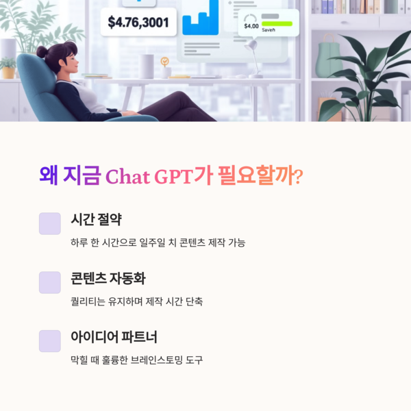 콘텐츠 만들 시간이 없는데도 매일 인스타 피드에 뭔가 올려야 한다는 압박감, 다들 느껴보셨죠? Chat GPT는 그 고통을 덜어줄 진짜 구세주 같은 존재예요. 하루 한 시간도 안 걸려서 일주일 치 콘텐츠 뽑을 수 있다면 믿으시겠어요? 이미 수많은 크리에이터들이 이 도구를 활용해 콘텐츠 루틴을 자동화하고, 퀄리티는 유지하면서도 시간은 줄이고 있어요. 게다가 아이디어가 막힐 때, Chat GPT는 정말 훌륭한 브레인스토밍 파트너가 되어줍니다.