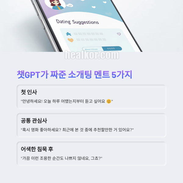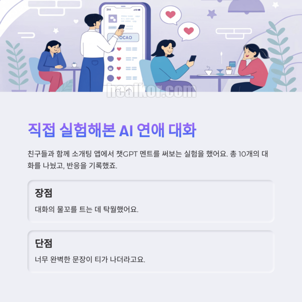 실제로 친구들과 함께 소개팅 앱에서 챗GPT가 만든 멘트를 써보는 실험을 했어요. 총 10개의 대화를 나눴고, 반응을 기록했죠. AI의 멘트는 어색하지 않았지만, 어느 순간 ‘너무 완벽한 문장’이 티가 나더라고요. 그래도 대화의 물꼬를 트는 데는 탁월했어요.