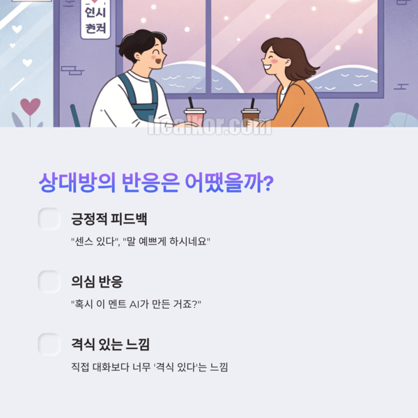 AI 멘트를 썼다고 무조건 반응이 좋은 건 아니에요. 하지만 준비된 대화는 확실히 분위기를 부드럽게 만들죠. 실제로 소개팅 앱 유저들의 후기를 보면 다음과 같은 반응들이 있었어요.