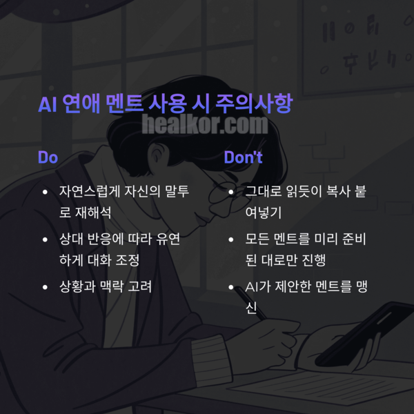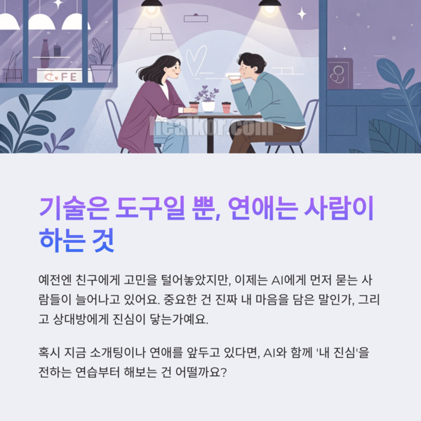 연애도 시대에 따라 달라지는 것 같아요. 예전엔 친구에게 고민을 털어놓았지만, 이제는 AI에게 먼저 묻는 사람들이 점점 늘어나고 있죠. 중요한 건 그게 진짜 내 마음을 담은 말인가, 그리고 상대방에게 진심이 닿는가인 것 같아요. 기술은 도구일 뿐, 결국 연애는 사람과 사람이 하는 거니까요.