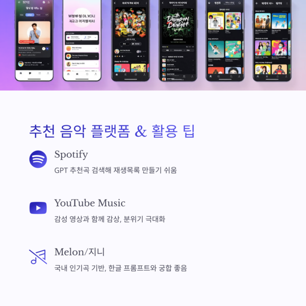 • Melon/지니 — 국내 인기곡 기반 추천, 한글 프롬프트와 궁합 좋음
