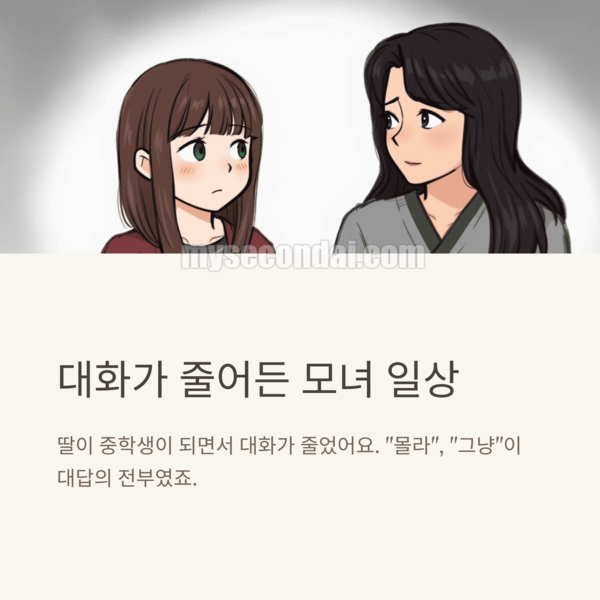 딸아이가 중학생이 되면서부터 대화가 점점 줄어들기 시작했어요. 예전엔 학교에서 있었던 일부터 친구 이야기도 종알종알 잘하더니, 어느 순간 대답은 "몰라", "그냥"으로 바뀌었죠. 괜히 물어봤다 싶을 때도 많았고요.