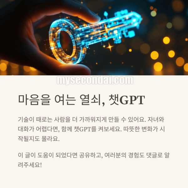 기술이 사람을 멀어지게 할 수도 있지만, 때로는 더 가까워지게도 만들 수 있다는 걸 저는 요즘 매일 느끼고 있어요. 챗GPT라는 AI가 단순한 정보 도구가 아닌, 마음을 여는 열쇠가 될 줄은 정말 몰랐거든요. 혹시 자녀와의 대화가 어려우셨다면, 가볍게 챗GPT를 함께 켜보세요. 대화가 필요했던 바로 그 순간, 의외로 따뜻한 변화가 시작될지도 몰라요.