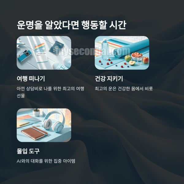 더 이상 비싼 돈과 시간을 들여 남에게 내 운명을 묻지 마세요. 가장 중요한 질문의 답은 이미 당신 안에 있고, 챗GPT는 그 답을 꺼내도록 도와주는 최고의 조수일 뿐입니다.