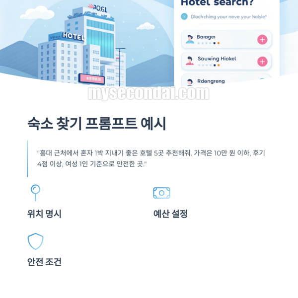 🛏️ “홍대 근처에서 혼자 1박 지내기 좋은 호텔 5곳 추천해줘. 가격은 10만 원 이하, 후기 4점 이상, 여성 1인 기준으로 안전한 곳.”