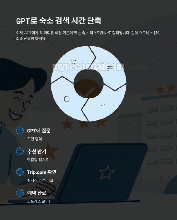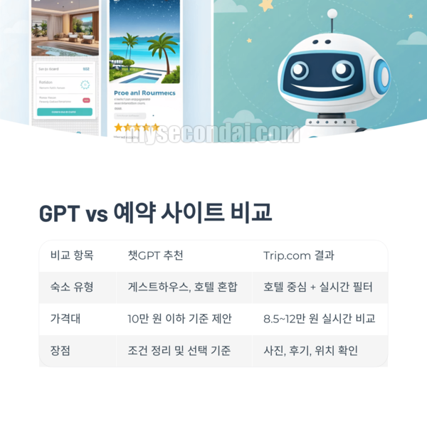 안녕하세요, 여행 준비를 즐기는 AI 활용러입니다. 요즘 챗GPT 덕분에 항공권부터 숙소까지 한 번에 비교하고 예약하는 방법을 찾았는데요, 진짜 꿀이에요. 특히 숙소는 조건이 복잡해서 검색만 해도 지치기 마련인데, 이젠 GPT에게 물어보면 1분 안에 정리된 추천 리스트가 나옵니다. 이번 글에서는 제가 실제로 숙소를 고르고 예약했던 과정, 프롬프트 예시, 그리고 Trip.com에서 최종 확정한 이유까지 솔직히 공유드릴게요.
