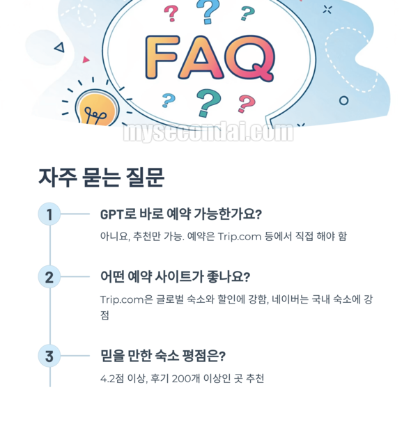 아니요, 챗GPT는 예약 기능은 없고 조건에 맞는 숙소를 추천해주는 데 탁월합니다. 예약은 Trip.com 등에서 직접 해야 합니다.