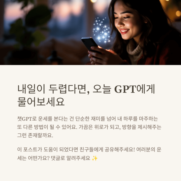 챗GPT로 운세를 본다는 건 단순히 재미를 넘어서, 내 하루를 마주하는 또 다른 방법이 될 수 있어요. 꼭 맞는 말이 아니어도, 오늘의 감정이나 태도를 정리하는 데는 꽤나 유용하더라고요. 가끔은 위로가 되고, 가끔은 방향을 제시해주는 그런 존재랄까요. 내일이 조금 두렵다면, 오늘 저녁 GPT에게 조용히 말 걸어보세요. “내일, 잘 될까?” 하고요. :)