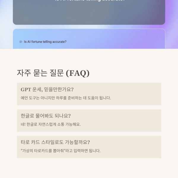 GPT는 실제 운명을 예언하는 도구는 아니에요. 다만 내가 원하는 방식으로 운세처럼 재구성해주기 때문에, 마음을 정리하거나 하루를 준비하는 데는 꽤 도움이 됩니다.