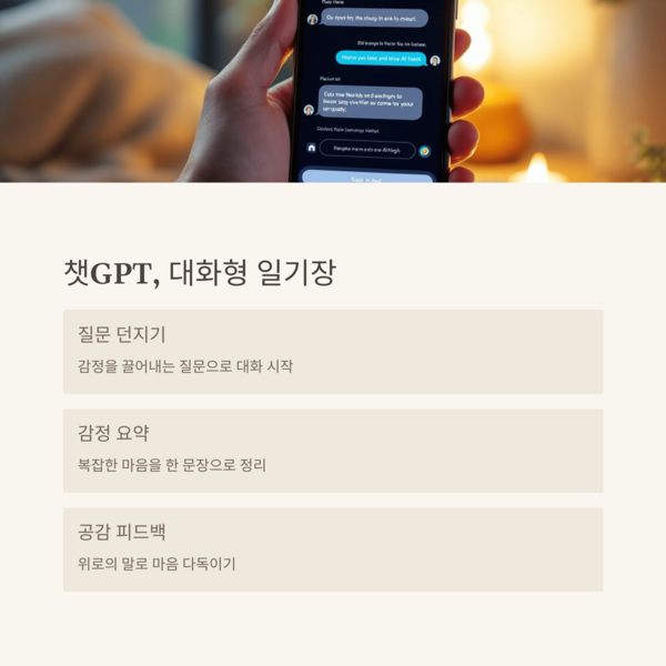 감정을 정리한다는 건 단순한 기록을 넘어서 나 자신과 마주하는 시간입니다. 바쁜 하루 속에서 잊혀졌던 내 마음을 챗GPT라는 조용한 친구와 함께 풀어보세요. 글 솜씨가 없어도 괜찮고, 매일 쓰지 않아도 괜찮습니다. 중요한 건 마음속 이야기를 꺼내는 것, 그 자체니까요. 오늘 밤, 조용히 스마트폰을 꺼내 "오늘 어땠는지 이야기해줘"라고 물어보세요. 생각보다 많은 위로가 돌아올지도 몰라요.