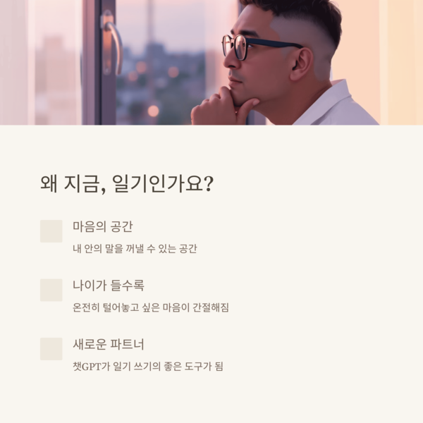 챗GPT는 단순한 기록자가 아니라, 감정을 끌어내는 질문을 잘 던지는 조력자예요. 글은 결국 내가 쓰는 거라 내 감정은 그대로 살아있답니다.
