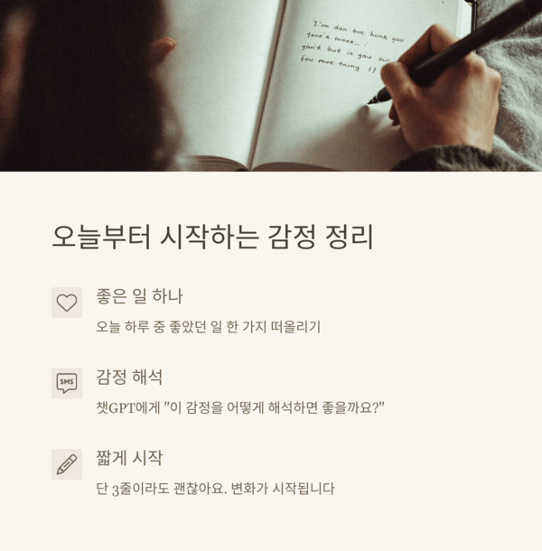 - 단 3줄이라도 괜찮아요. 글로 남기기 시작하면 변화가 시작됩니다
