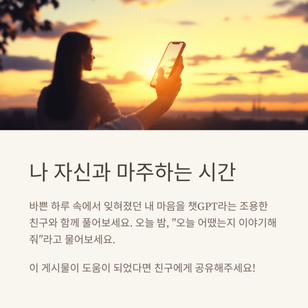 감정을 정리한다는 건 단순한 기록을 넘어서 나 자신과 마주하는 시간입니다. 바쁜 하루 속에서 잊혀졌던 내 마음을 챗GPT라는 조용한 친구와 함께 풀어보세요. 글 솜씨가 없어도 괜찮고, 매일 쓰지 않아도 괜찮습니다. 중요한 건 마음속 이야기를 꺼내는 것, 그 자체니까요. 오늘 밤, 조용히 스마트폰을 꺼내 "오늘 어땠는지 이야기해줘"라고 물어보세요. 생각보다 많은 위로가 돌아올지도 몰라요.