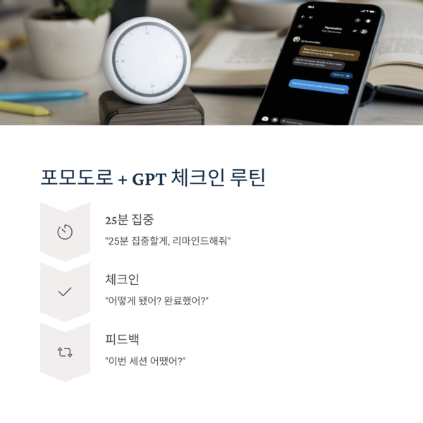 “오늘 할 일은 A, B, C야. 일정표처럼 정리해줘.” / “지금부터 25분 집중할게. 끝나면 확인해줘.” / “하루 요약 + 내일 우선순위 3개 알려줘.” 같은 명령이 좋아요.