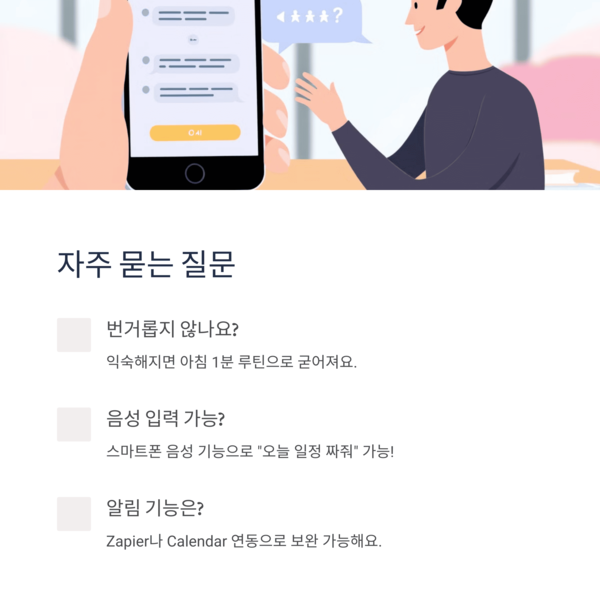 | “내일 우선순위 3가지 추려줘” | “1. 업무 보고 정리, 2. 운동 재개, 3. 야근 일정 확인” |