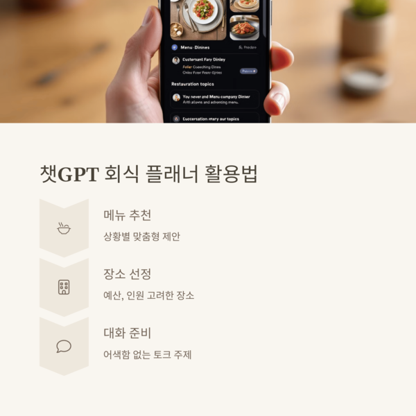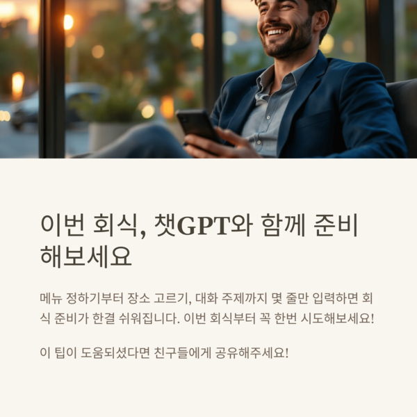안녕하세요, 직장인 분들~ 오늘도 회식 일정 잡고 '뭐 먹지?' 고민 중이신가요? 삼겹살, 치킨, 곱창... 매번 똑같은 메뉴에 지치셨다면 이제는 조금 다르게 접근해 보는 건 어때요? 저는 요즘 회식 때마다 챗GPT한테 도움을 받는데, 이게 진짜 물건이에요. 메뉴 추천은 기본이고, 팀원들 알레르기나 선호도 반영, 심지어 어색한 자리에서 할 수 있는 대화 주제까지 챙겨주거든요. 오늘은 제가 실제로 써본 꿀팁을 공유해 볼게요!