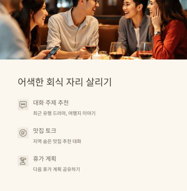 그 분위기 알죠? 음식은 나왔는데, 대화는 안 터질 때. 그럴 때 GPT에게 "어색한 회식자리에서 쓸만한 대화 주제 알려줘" 하면 해결돼요. 요즘 유행하는 드라마, 무난한 여행지 추천, 점심 메뉴 토크까지 딱딱 잘 맞춰서 제안해 줍니다.