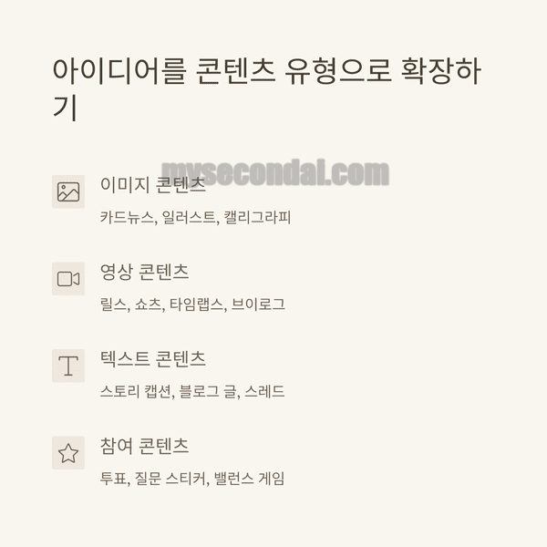 - 이미지 콘텐츠: 카드뉴스, 일러스트, 캘리그라피로 표현