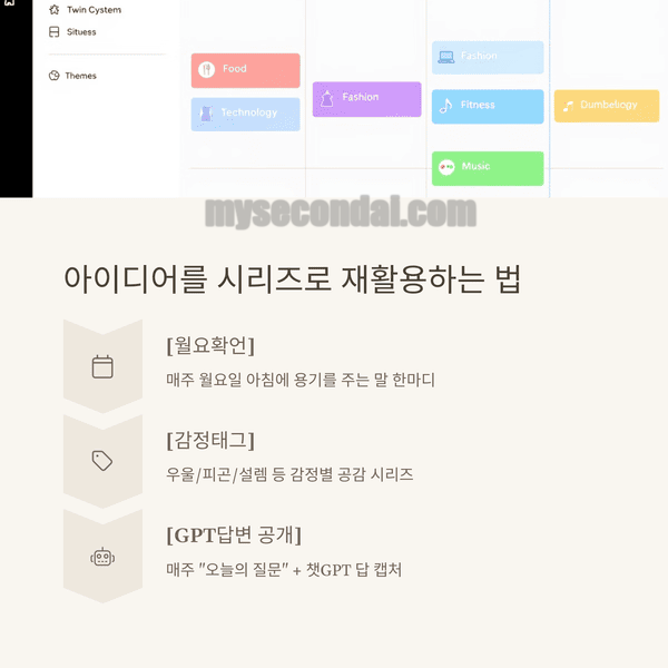 GPT가 뽑아준 콘텐츠 아이디어는 시리즈화하면 가장 효율적으로 사용됩니다. 예를 들어 “하루 확언 카드” 콘텐츠가 있다면, 이를 매일 아침 시리즈로 운영하면서 팔로워와의 루틴을 만들 수 있어요.
