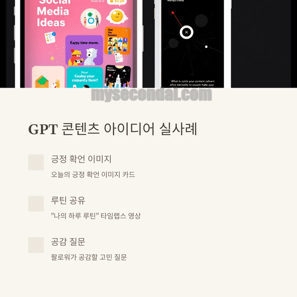 GPT가 뽑아준 콘텐츠 아이디어는 시리즈화하면 가장 효율적으로 사용됩니다. 예를 들어 “하루 확언 카드” 콘텐츠가 있다면, 이를 매일 아침 시리즈로 운영하면서 팔로워와의 루틴을 만들 수 있어요.