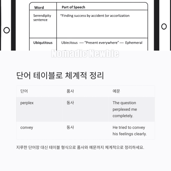 지루한 단어장 시대는 갔습니다. 대신 아래처럼 테이블 형식으로 챗GPT에게 요청하면 더 체계적으로 정리되고 눈에도 쏙 들어오죠. 특히 품사나 예문까지 함께 넣으면 학습 효과가 훨씬 올라갑니다.