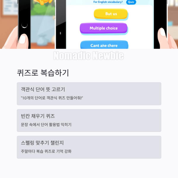 “오늘 외운 단어들로 객관식 퀴즈 만들어줘” 혹은 “빈칸 채우기 문제 5개 만들어줘”라고 입력하면 됩니다.