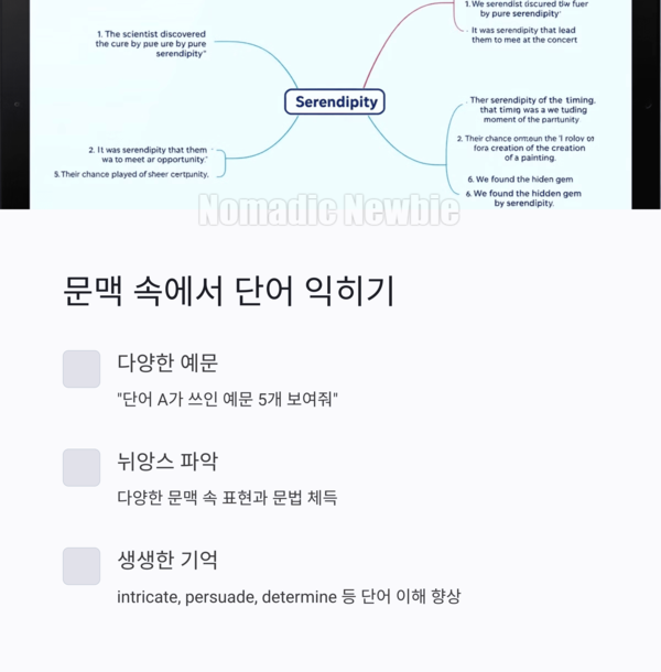 단어를 단독으로 외우는 건 이제 비효율적이에요. 챗GPT에게 "단어 A가 쓰인 예문 5개 보여줘"라고 요청하면 다양한 문맥 속 예시를 알려줘요. 그걸 바탕으로 단어의 뉘앙스, 자주 쓰이는 표현, 문법까지 자연스럽게 체득할 수 있죠. 이 방법으로 'intricate', 'persuade', 'determine' 같은 단어들이 훨씬 더 생생하게 머릿속에 남았어요.