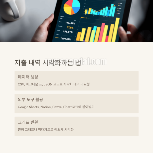 챗GPT는 자체적으로 차트를 그릴 순 없지만, CSV, 마크다운 표, 코드로 시각화 데이터를 만들어줄 수 있어요. 이를 Google Sheets나 Notion, Canva, ChartGPT 같은 툴에 붙여넣으면 예쁜 원형 그래프나 막대차트로 변환 가능합니다.